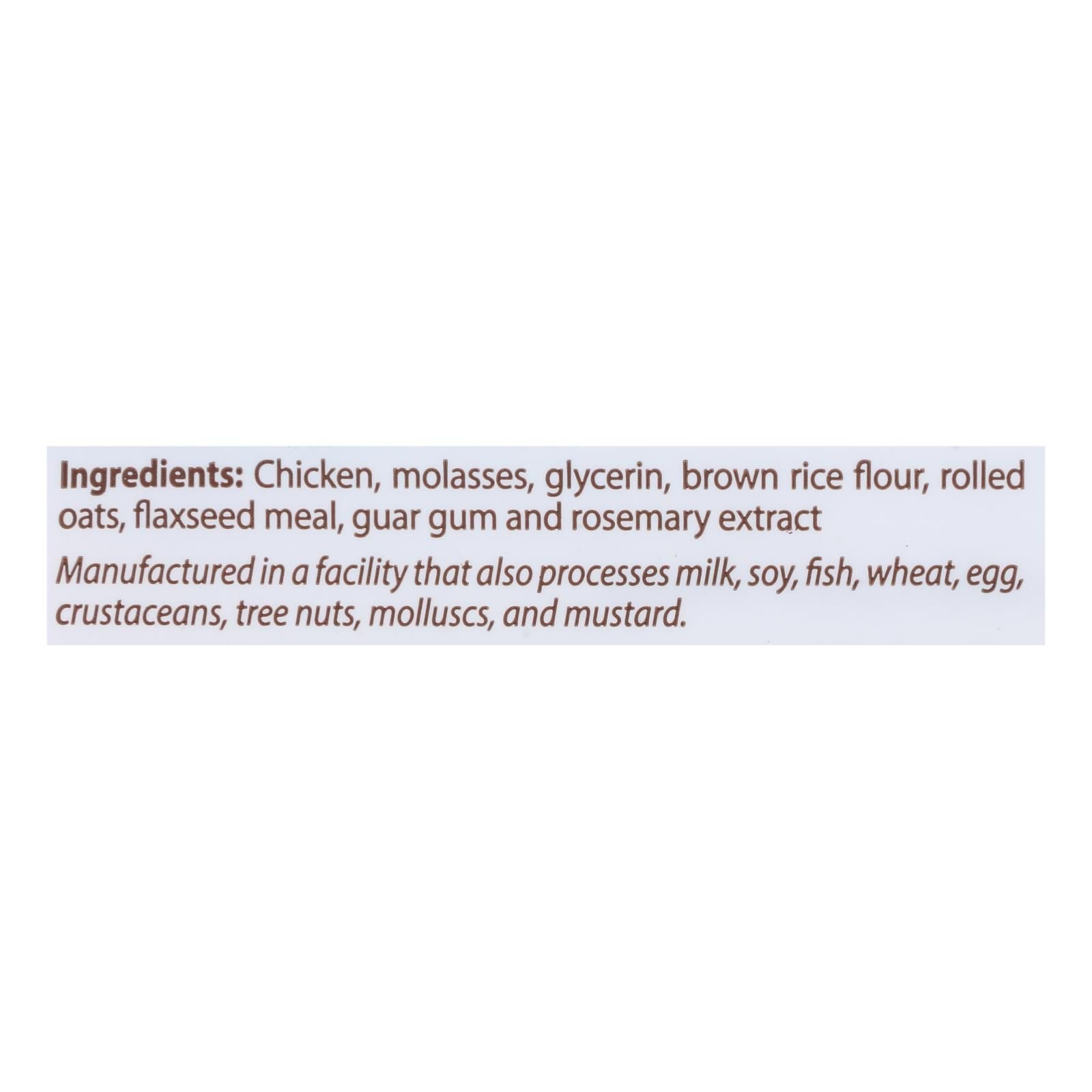 ingredients : chicken, molasses, glycerin, brown rice flour, rolled oats, flaxseed meal, guar gum and rosemary extract.
