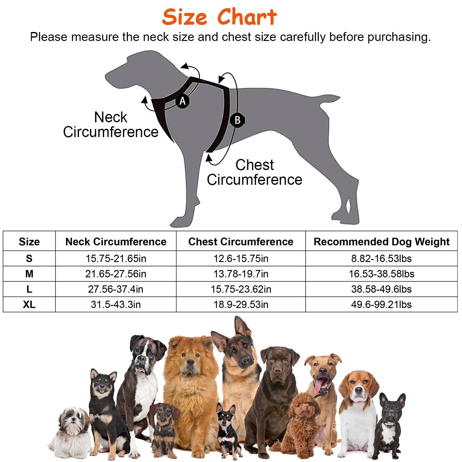 *Multi-Choice Dog Harness*:S-XL Sizes are provided,you can choose a suitable harness vest for your dogs,great for dogs whose weight is between 8.82-99.21lbs,such as Anatolian Shepherd,Newfoundland,Teddy,Pomeranian,Husky,etc.. Please measure the neck circumference and chest circumference of your dog carefully before purchasing.