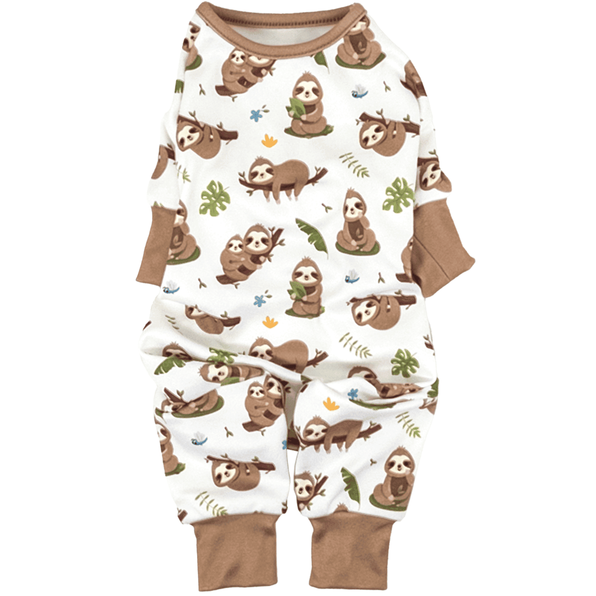 Take it slow and let your dog relax in ultimate comfort with our soft dog pajamas featuring adorable sloth prints. Super soft fabric with brown cuffs, this full-body onesie features a lazy day sloth print and comes in sizes XS to XXL.  Thoughtfully designed with a convenient leash hole, it's perfect for lounging or keeping your pup warm during chilly nights.